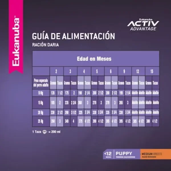 Eukanuba Puppy Medium Breed es un alimento balanceado completo para cachorros entre 1 y 12 meses de edad, de razas medianas como Bulldog Francés, Beagle, Bretón, Cocker, Boxer, Schnauzer Standard y otras razas o perros mestizos que en su etapa adulta pesan entre 10 y 25 kg.