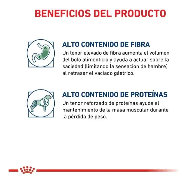 Royal Canin produce alimentos centrados en las necesidades únicas de tu mascota, brinda una nutrición específica y eficaz, y lo ayuda a convertirse en su mejor versión. Tu mascota siempre saludable Ellos son parte de la familia y nos regalan su compañía y su cariño. Para que se mantengan sanos y fuertes, una alimentación balanceada es esencial. Brindale a tu perro los nutrientes que necesita para que pueda correr, saltar y jugar todo el día. Control de peso Los kilos de más pueden perjudicar la calidad de vida de tu mascota al disminuir su movilidad. Este alimento contiene menor cantidad de grasa que la comida estándar y, a su vez, está enriquecido con nutrientes esenciales para satisfacer todas sus necesidades. Beneficios del alimento seco La mayor ventaja de la comida seca para mascotas es que se puede almacenar por mucho más tiempo sin que se deteriore, y evita la aparición de hongos o bacterias. Además, este tipo de alimento ayuda a eliminar el sarro y a retrasar la formación de la placa dental con el proceso de masticación y trituración.